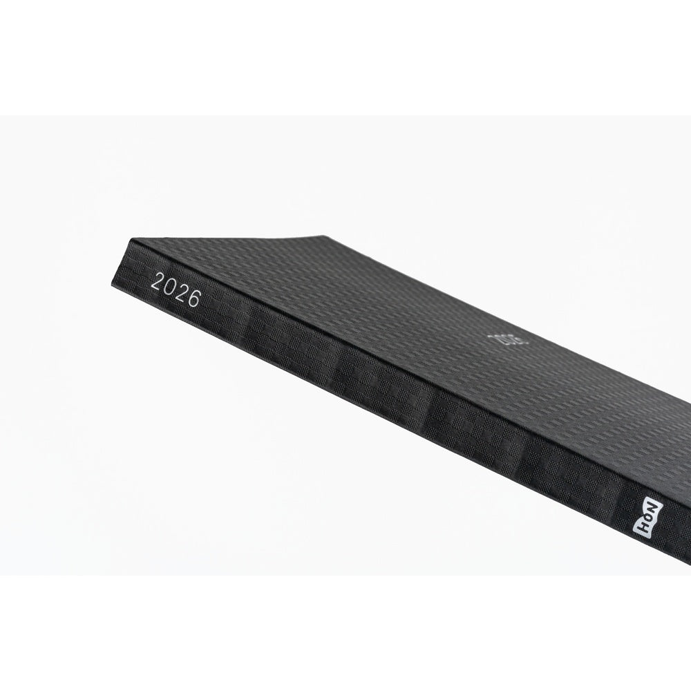 While this may look like an ordinary black techo, it is actually embossed an all sides in a plaid pattern. While the surface might by textured, it feels smooth to the touch. Depending on the angle of the light, you can see the gingham pattern shine. The year 2026 is stamped in silver foil onto the cover. It has a lightweight paper cover and comes with a pencil board.