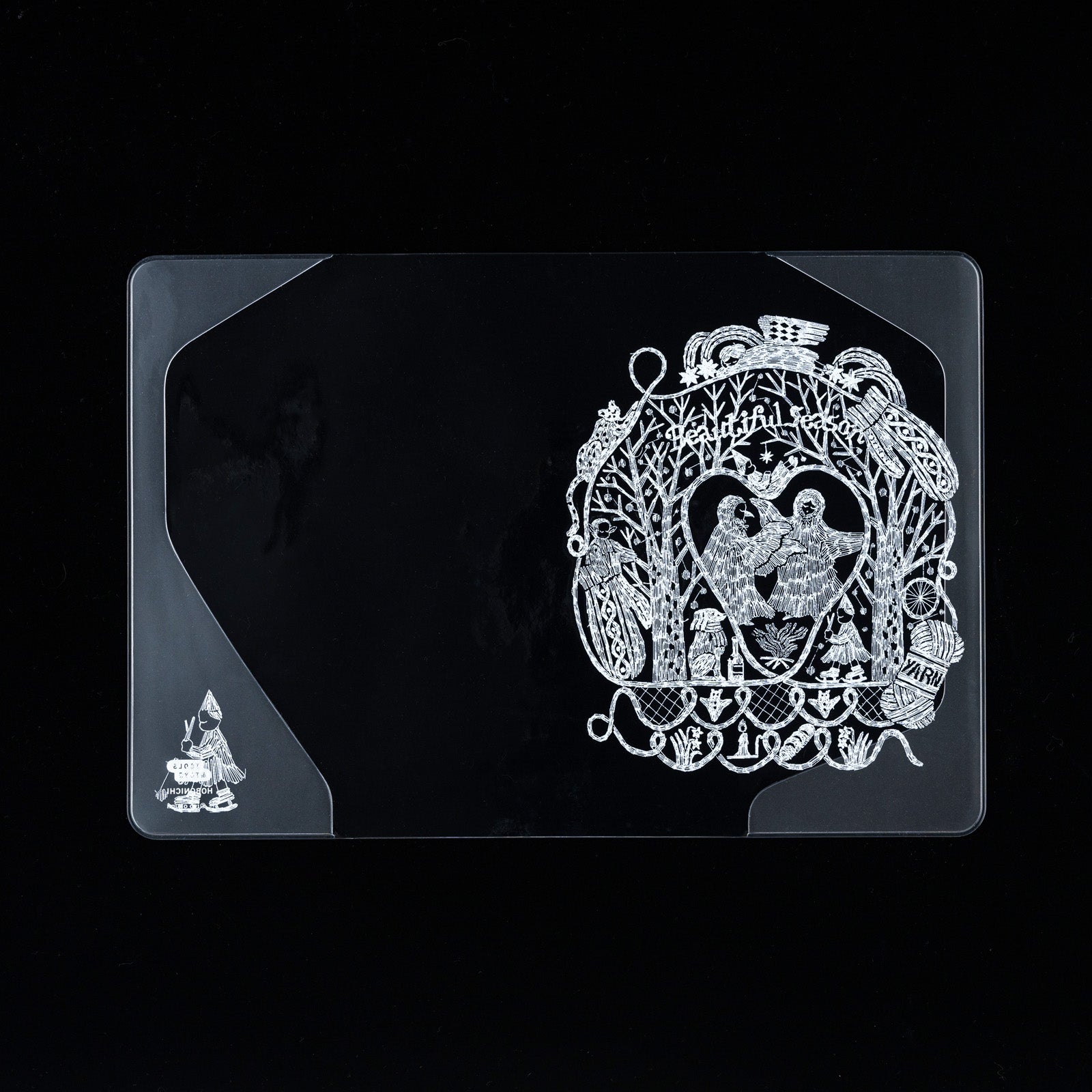 This clear cover fits onto a Hobonichi Techo cover to protect it from wear and tear. This is a print of embroiderer and illustrator Iyo Okumi's embroidered artwork. This is called "Beautiful Season" and depicts the beauty of the winter season.