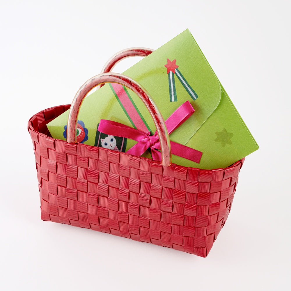 A mini paper file decorated with Yumi Kitagishi’s illustrations. A vivid young grass green accented with a shocking pink ribbon. This is a life-size recreation of an item illustrated in Yumi Kitagishi’s artwork "A White Cat’s Diary". A special piece of stationery that feels like it leapt straight out of the white cat’s whimsical world.