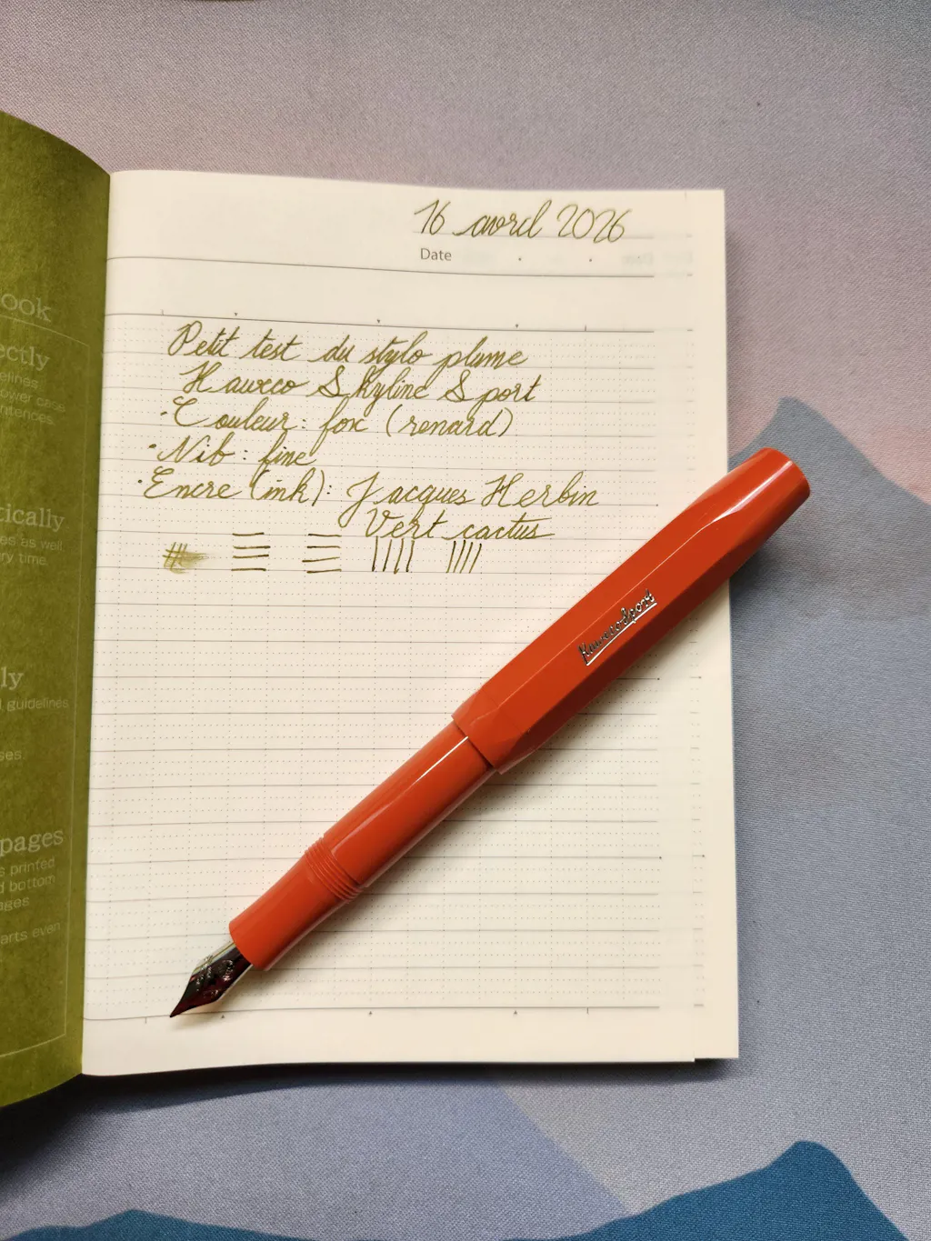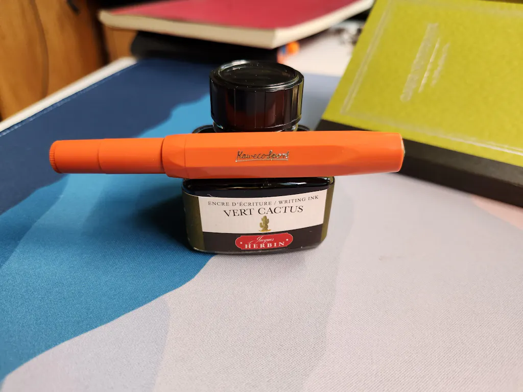 Mon premier stylo plume de la marque Kaweco, j'en suis très content! La couleur est un peu plus vive que celle présentée, comme le démontre la photo incluse. J'ai rempli et installé le convertisseur, et le débit d'encre ne s'est pas fait attendre, c'est plaisant. L'encre commence à couler instantanément.