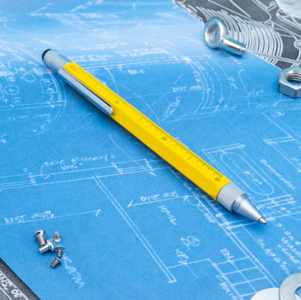 The heavy weight, 6-sided barrel houses a smooth writing Soft-Roll ballpoint at one end and an ultra sensitive touch screen stylus at the other. Under the stylus top are phillips and flat head screwdrivers, while on the barrel are a built- in level, ruler and 3 different scale functions. The chiseled spring clip will hold the One Touch Tool pen securely in your pocket, ready to handle more jobs than any other pen!