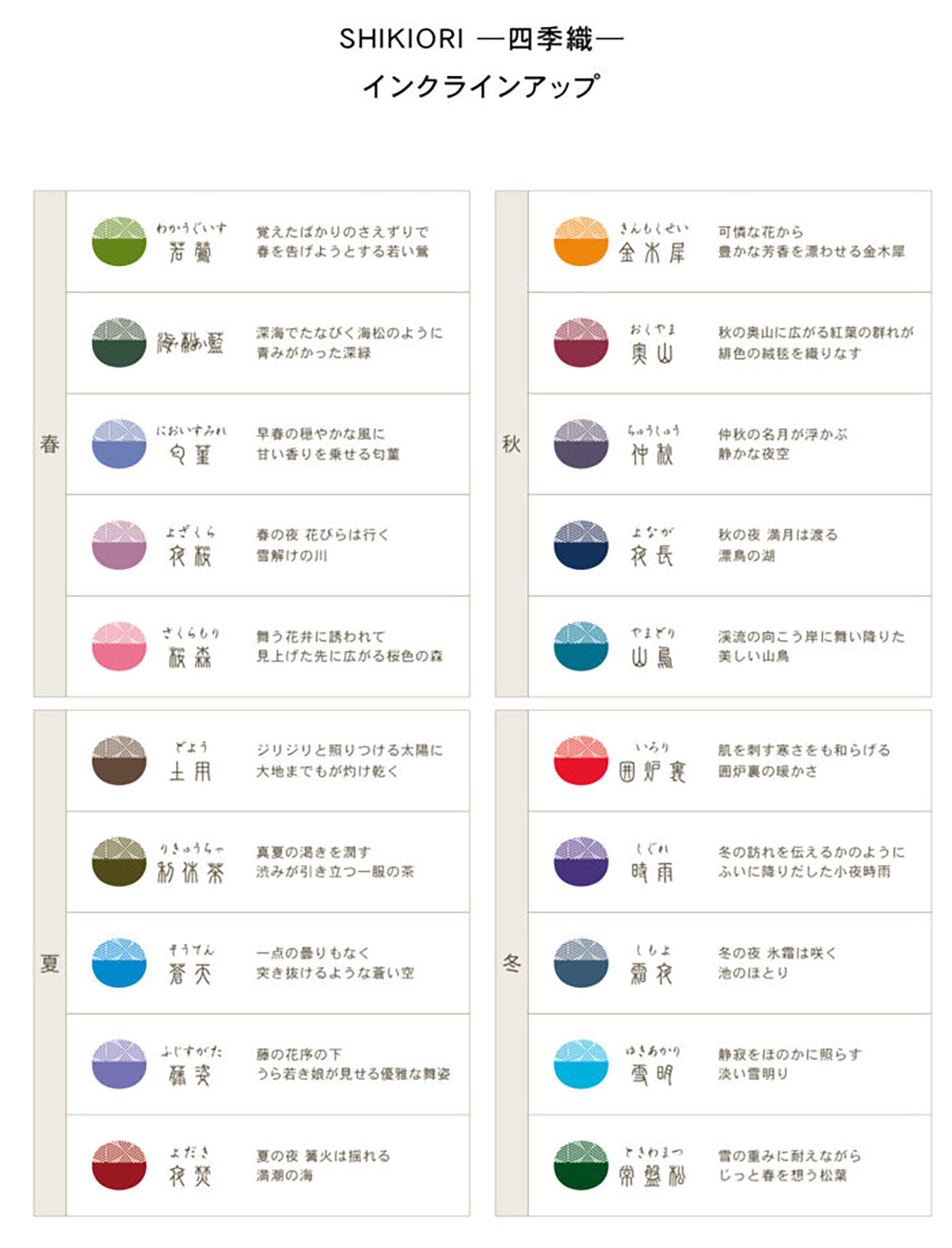 - The gentle rains of spring are expressed with the light teal color of Shitoshito, meaning ‘silent and still.’