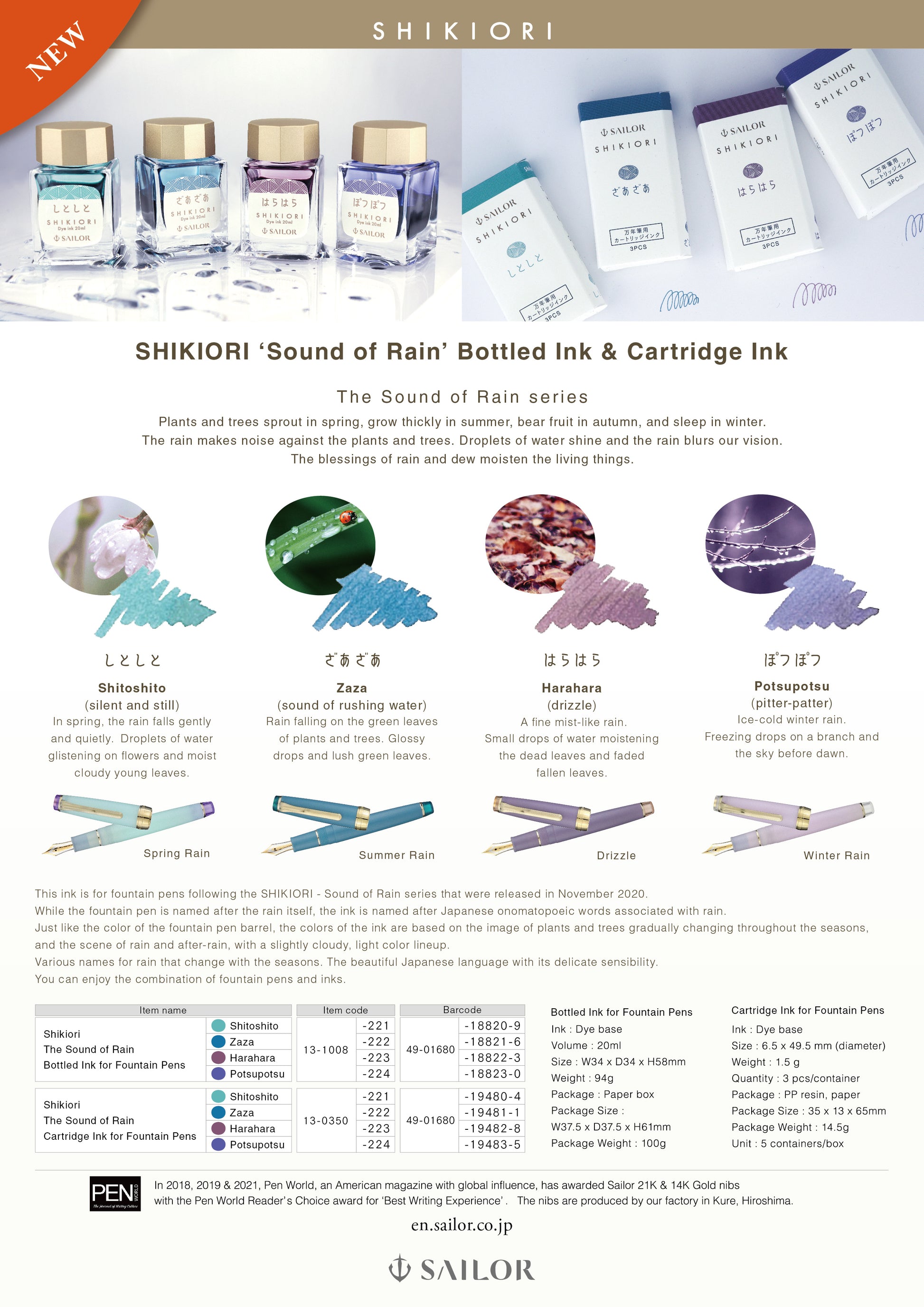 Designed as companion inks to the Sound of Rain fountain pens that Sailor released in 2021, these inks are named for the different sounds that rain makes as it falls.
