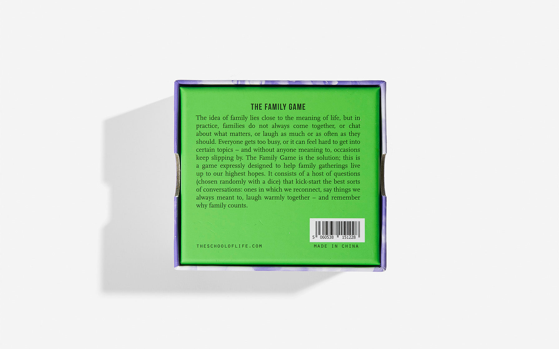 The idea of family lies close to the meaning of life, but in practice, families do not always come together, or chat about what matters, or laugh as much or as often as they should. Everyone gets too busy, or it can feel hard to get into certain topics – and without anyone meaning to, occasions keep slipping by. The Family Game is the solution; this is a game expressly designed to help family gatherings live up to our highest hopes. It consists of a host of questions (chosen randomly with a dice) that kick-start the best sorts of conversations: ones in which we reconnect, say things we always meant to, laugh warmly together – and remember why family counts.